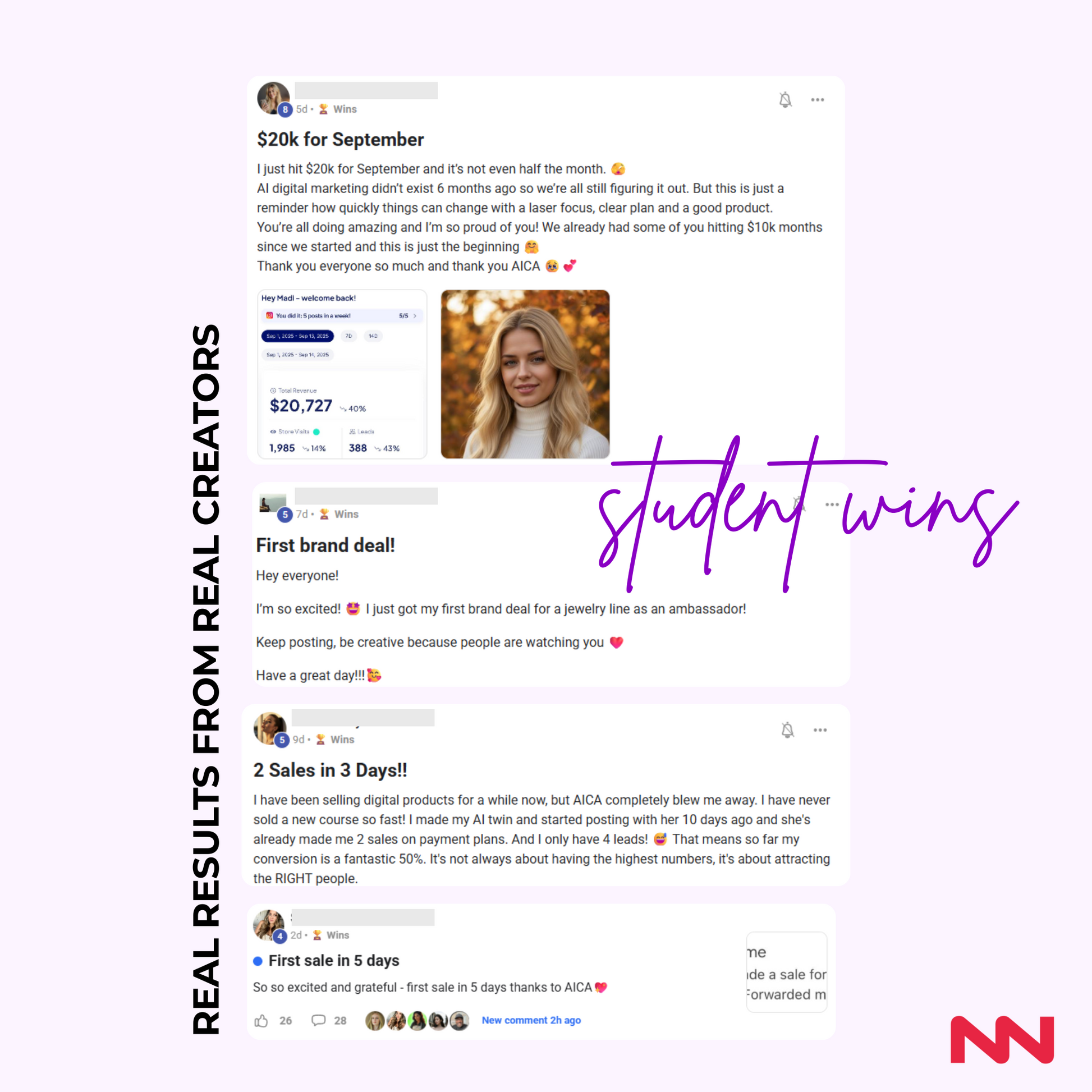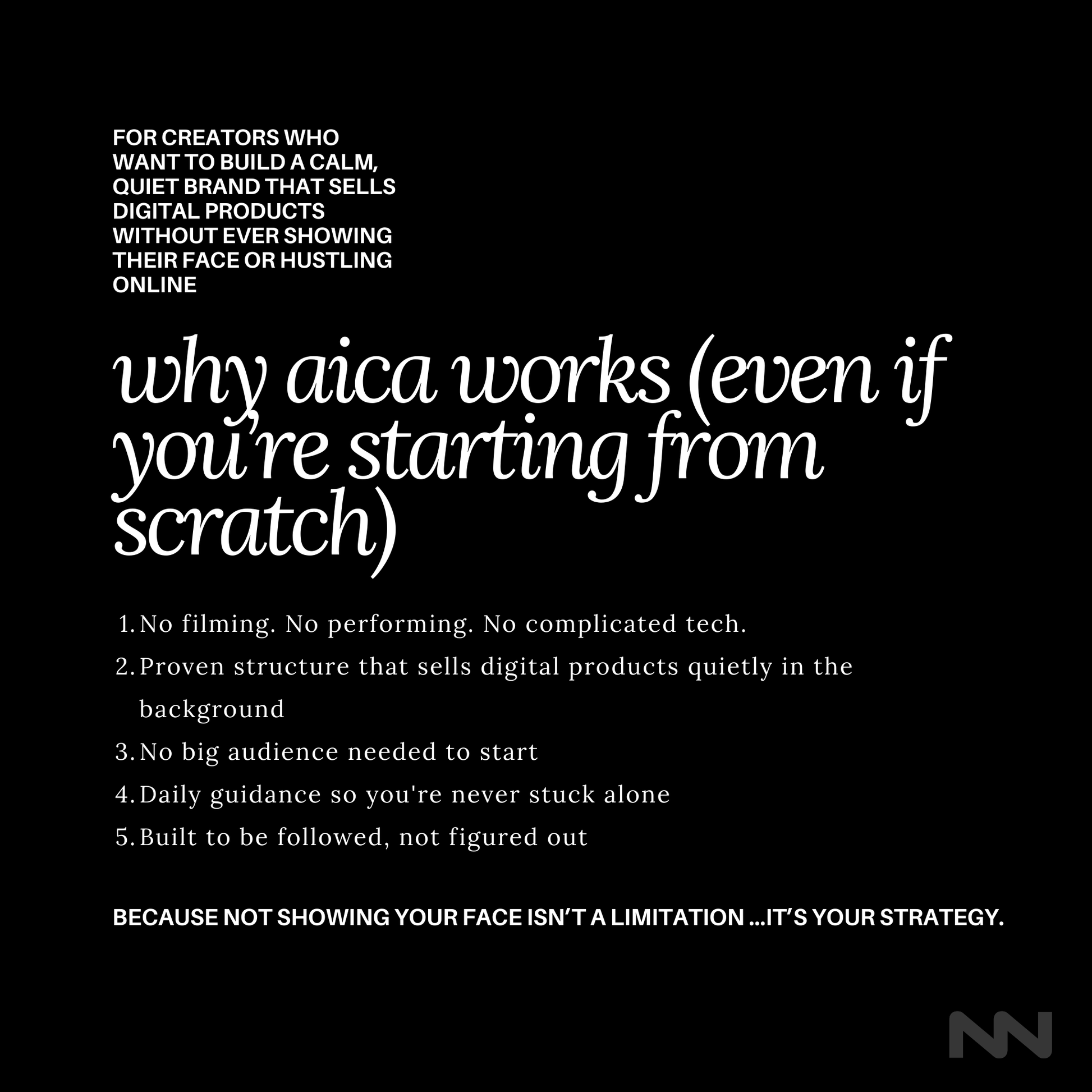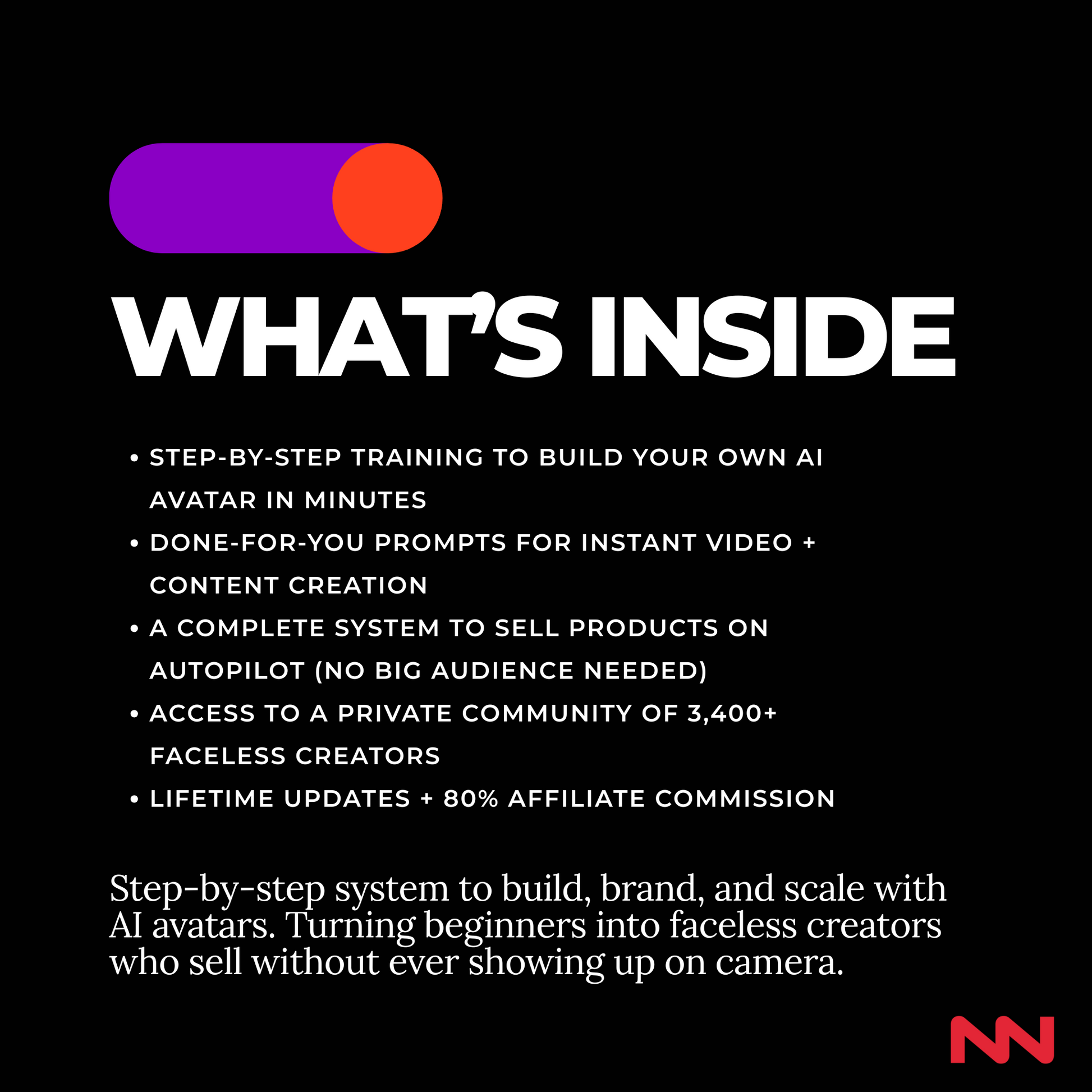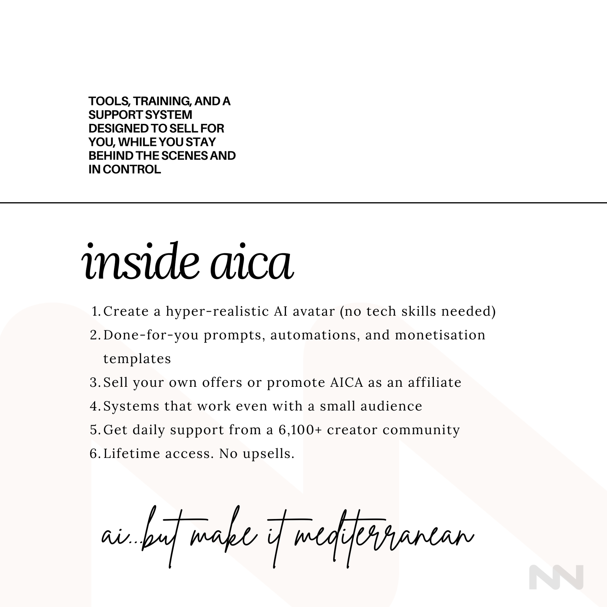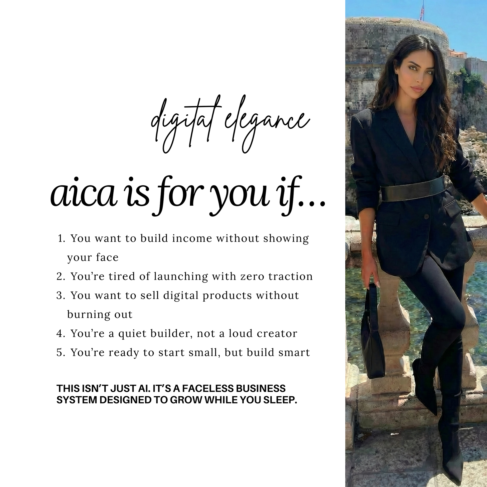 The AICA program that teaches you how to create hyper-realistic AI avatars that work, sell, and scale for you. Instead of filming yourself or showing your face, you’ll learn how to design AI-powered twins that represent your brand, create professional videos in minutes, and help you grow a profitable online business on autopilot.
