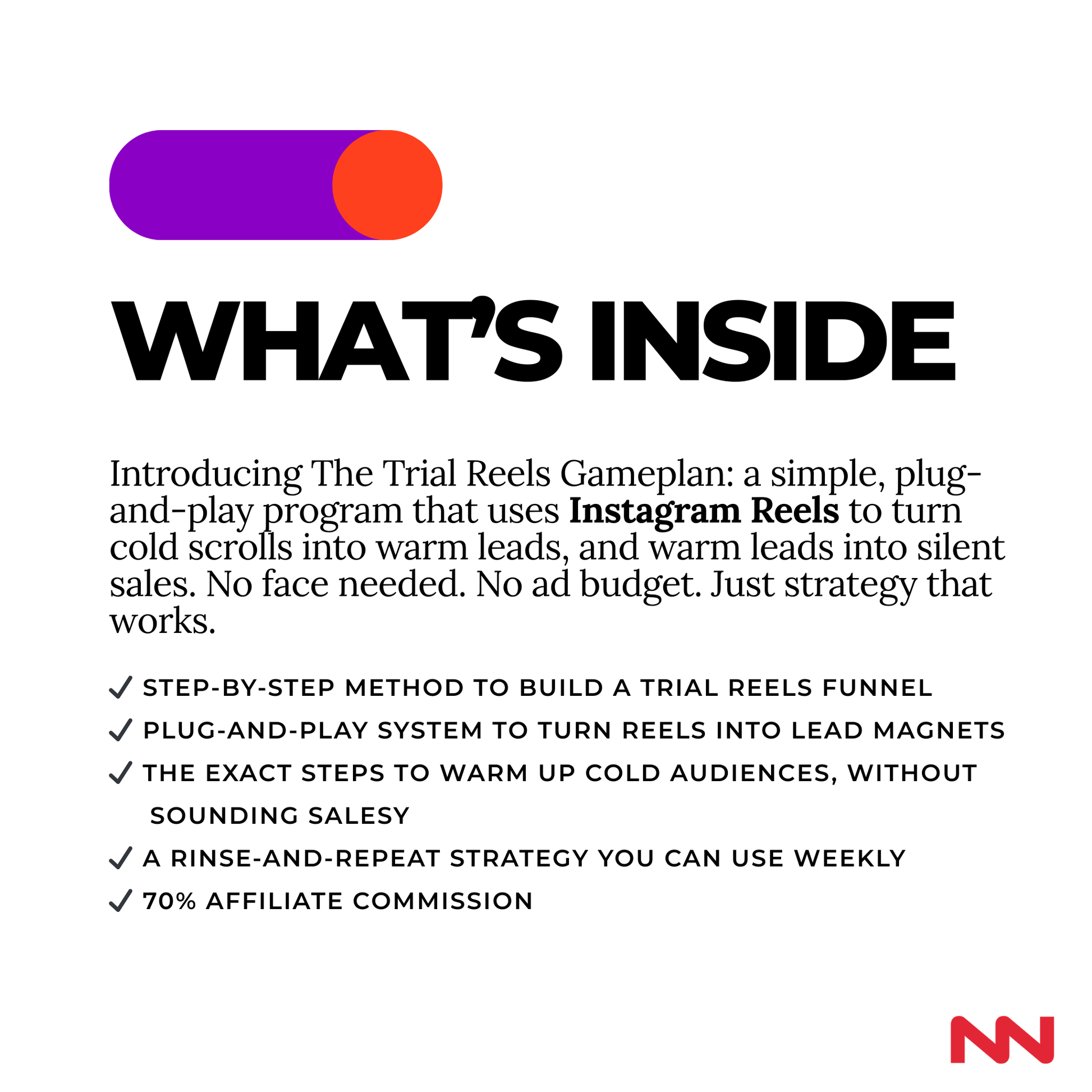 A simple, plug-and-play program that uses Instagram Reels to turn cold scrolls into warm leads, and warm leads into silent sales. No face needed. No ad budget. Just strategy that works.